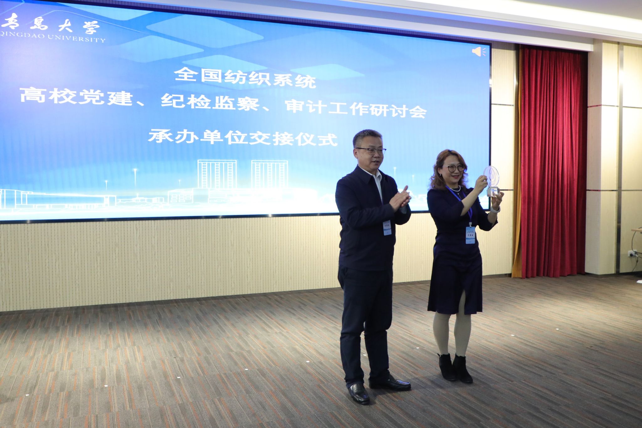 会上,青岛大学党委书记胡金焱同志致欢迎辞,天津工业大学等6所学校进行了大会主题发言。会议还举行了“全国纺织系统高校党建、纪检监察、审计工作研讨会”会徽及印章交接仪式,2024年,研讨会将由我校承办,刘东渝同志代表学校发言。